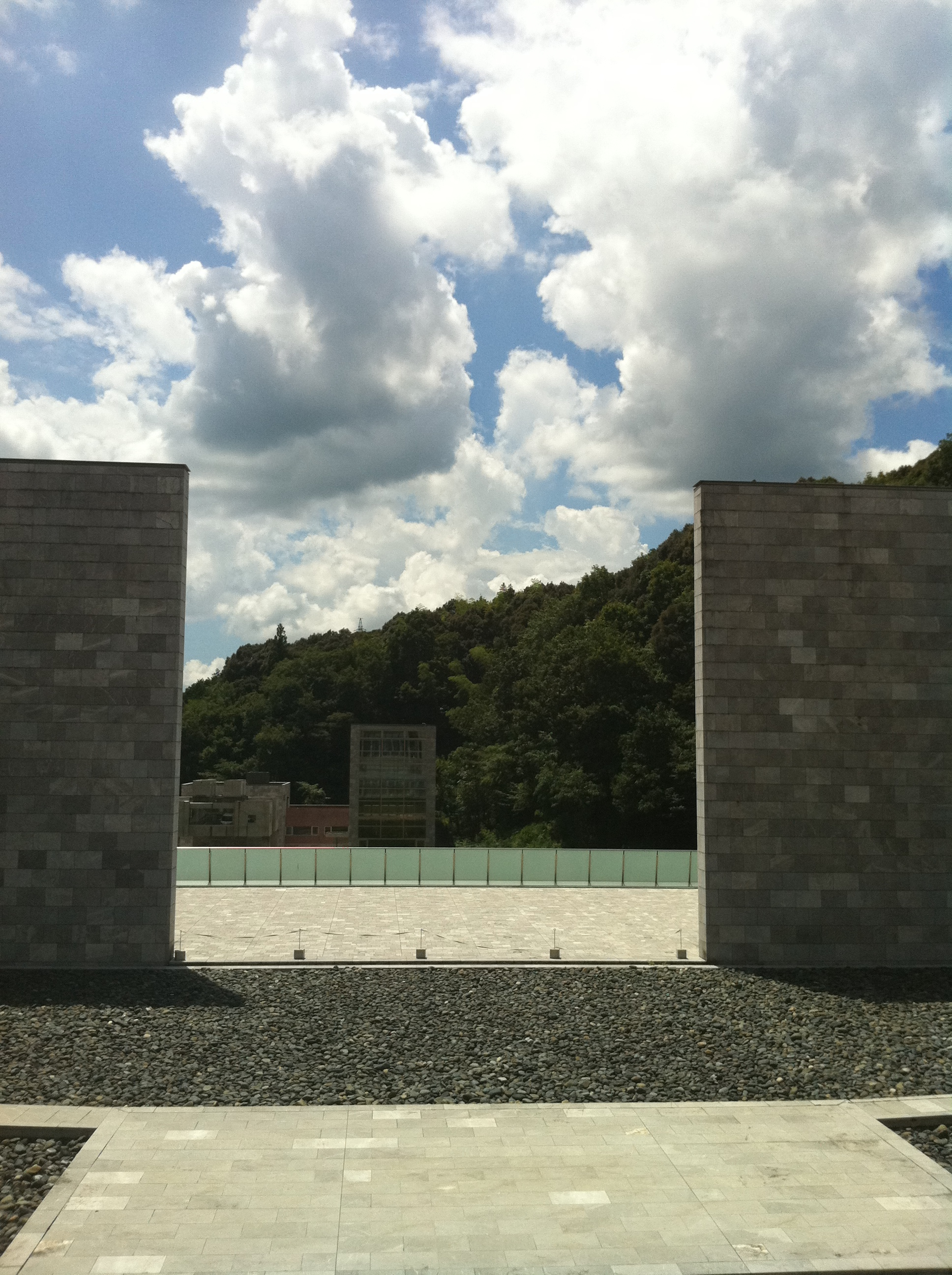 まずは管理棟から宿泊棟を。手前は野外の舞台として使用可能ですが、この暑さではちょっと無理。
