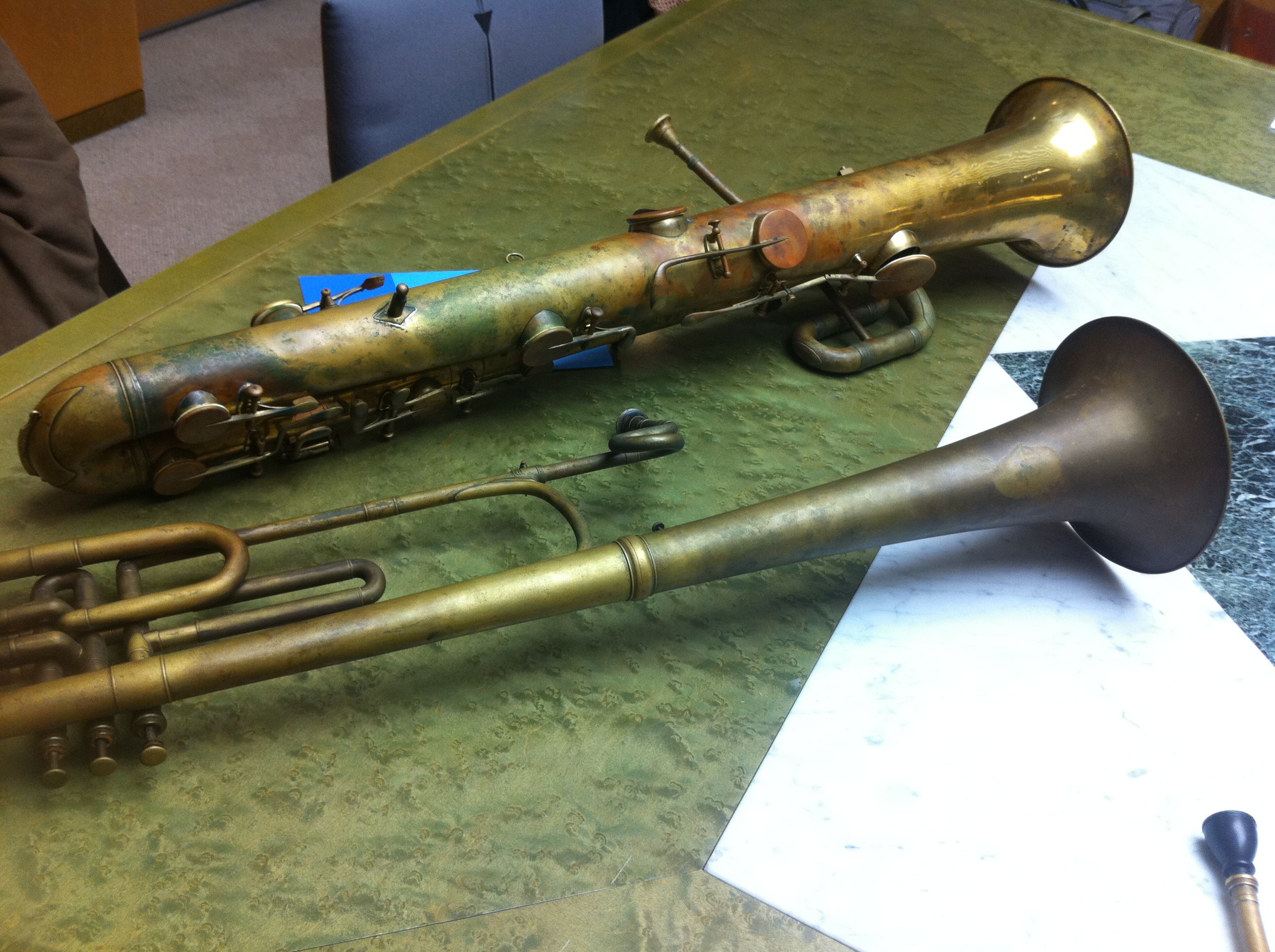 前回に引き続き、オフィクレイド(奥)とクラヴィコール(手前)。ラッシャン・バスーンの形状からオフィクレイド、そしてその構え方からクラヴィコール、そして現在のチューバと並べてみると、その変遷がよく判りますね。佐伯茂樹さんのお話の中にもありましたが、これらが同時期に並行して存在して使われていた19世紀は非常に面白い時代だと思います。
